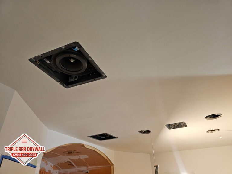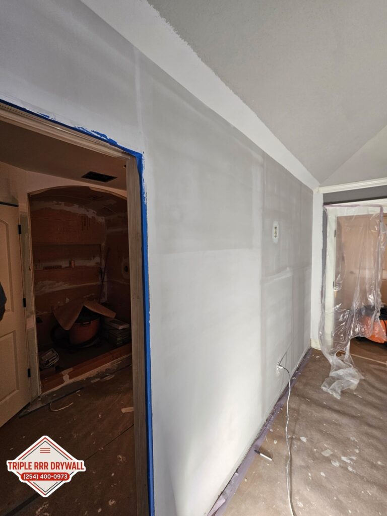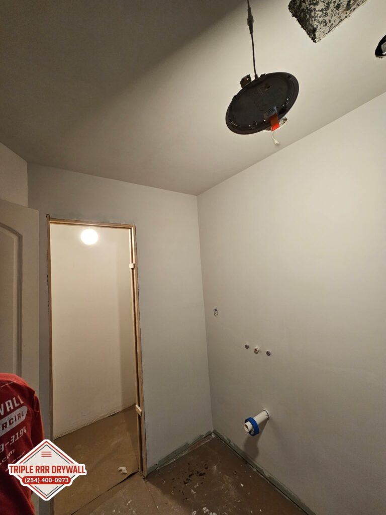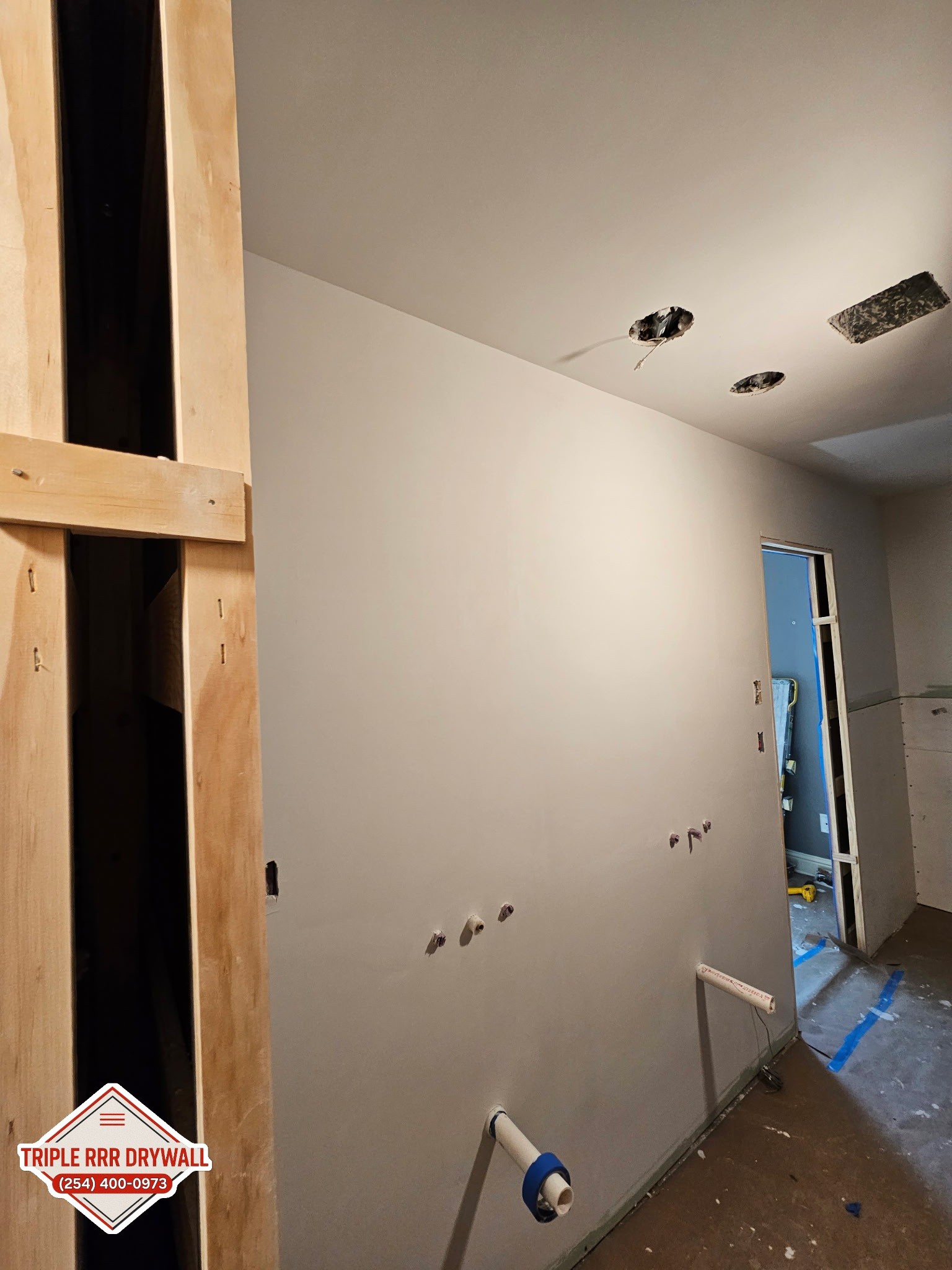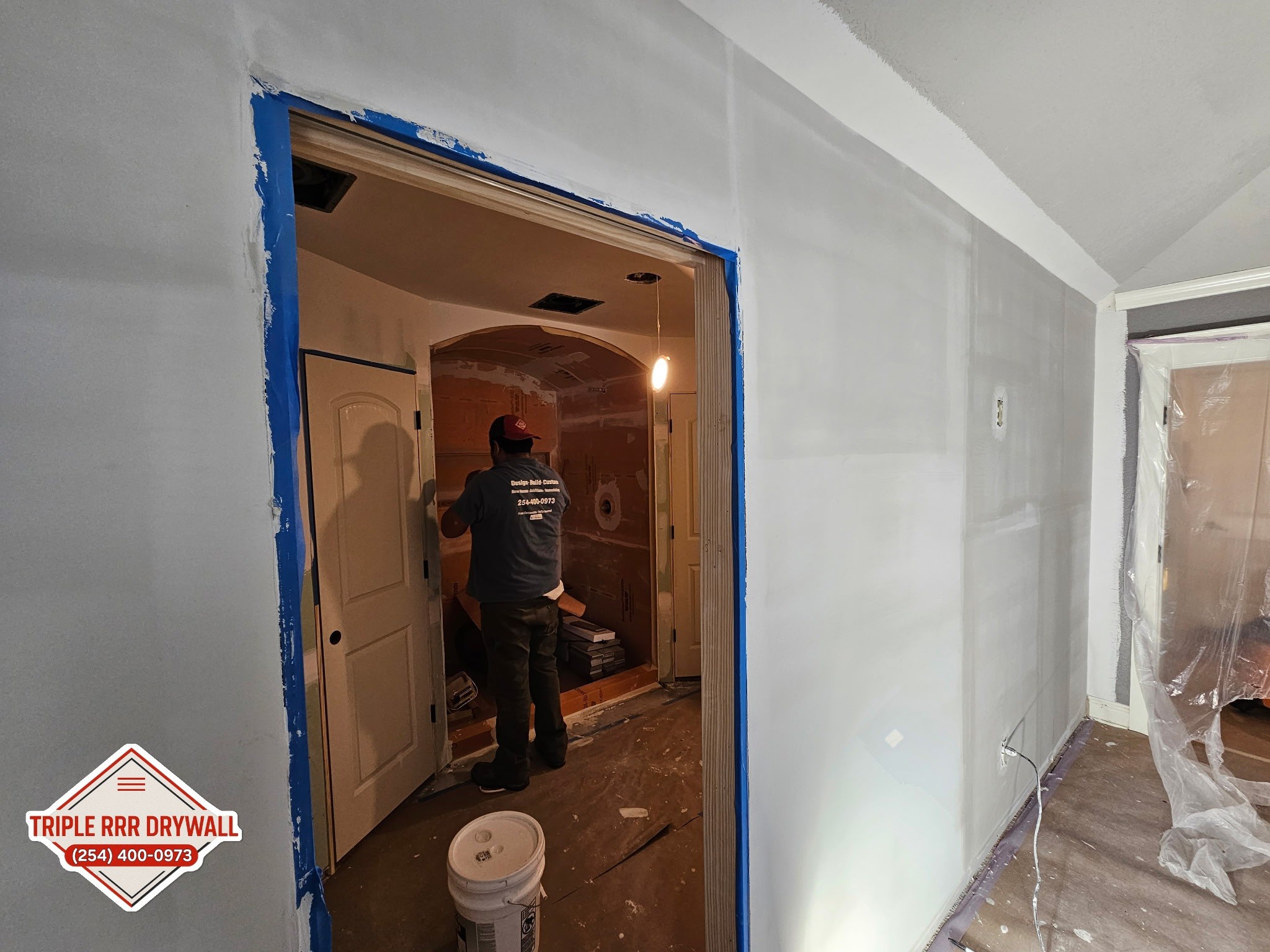Our team at Triple RRR Drywall making progress on this restroom remodel in China Spring. We ensure every surface, especially challenging features like these custom archways, get that premium skim coating and perfect primer base.