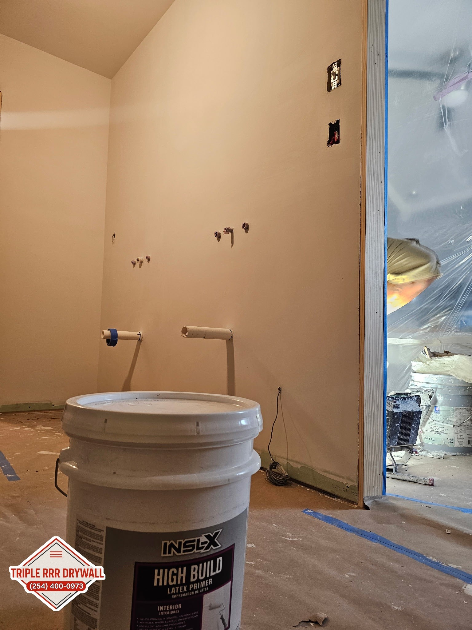 Why do we use high build Latex primer? Because it’s essential for achieving an ultra smooth level 5 finish by minimizing minor surface imperfections before the final paint coat. Quality products for quality results in Central Texas.